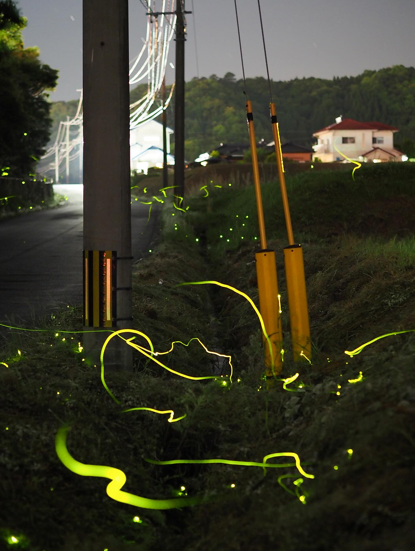 電気で明かりを届ける電柱と、夏の風物詩であるホタルの淡い光が重なり合い、日本の四季を感じさせる一枚です。