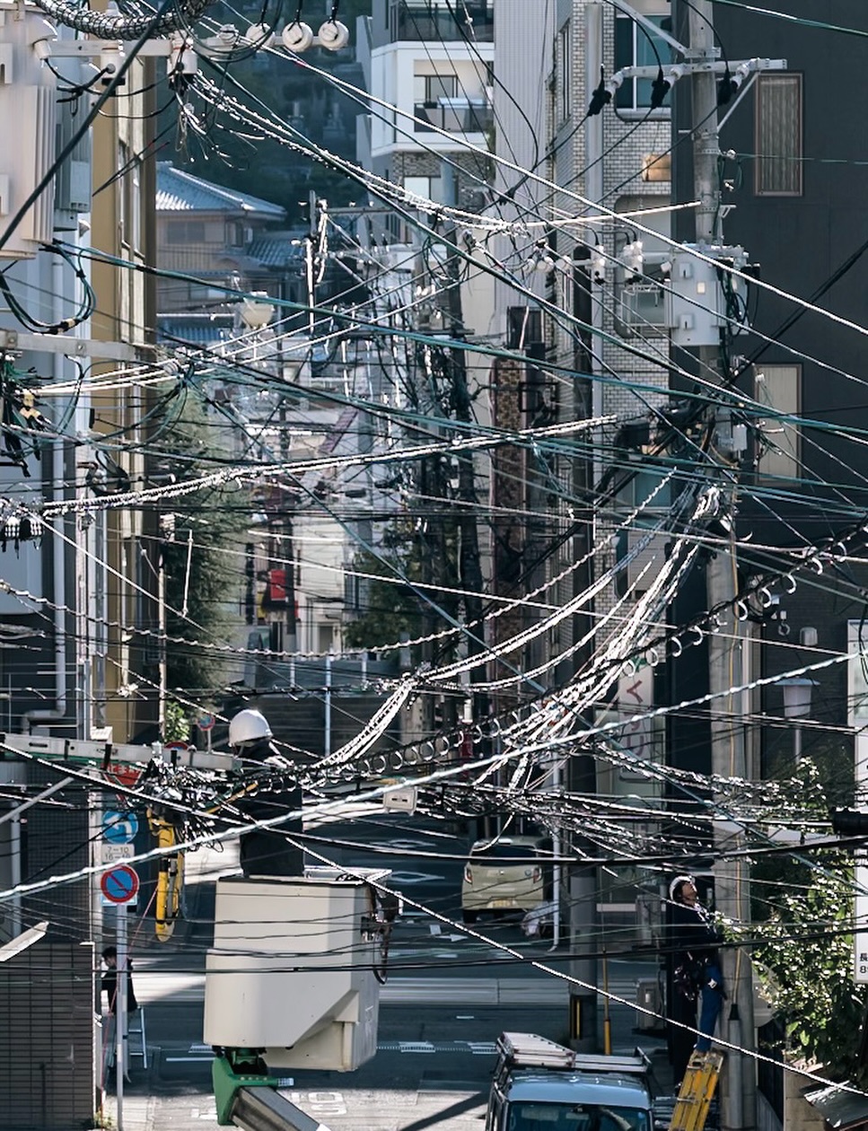 日常の作業が芸術的な表情を帯び、電線と人との関わりを改めて感じさせてくれる素敵な作品です。