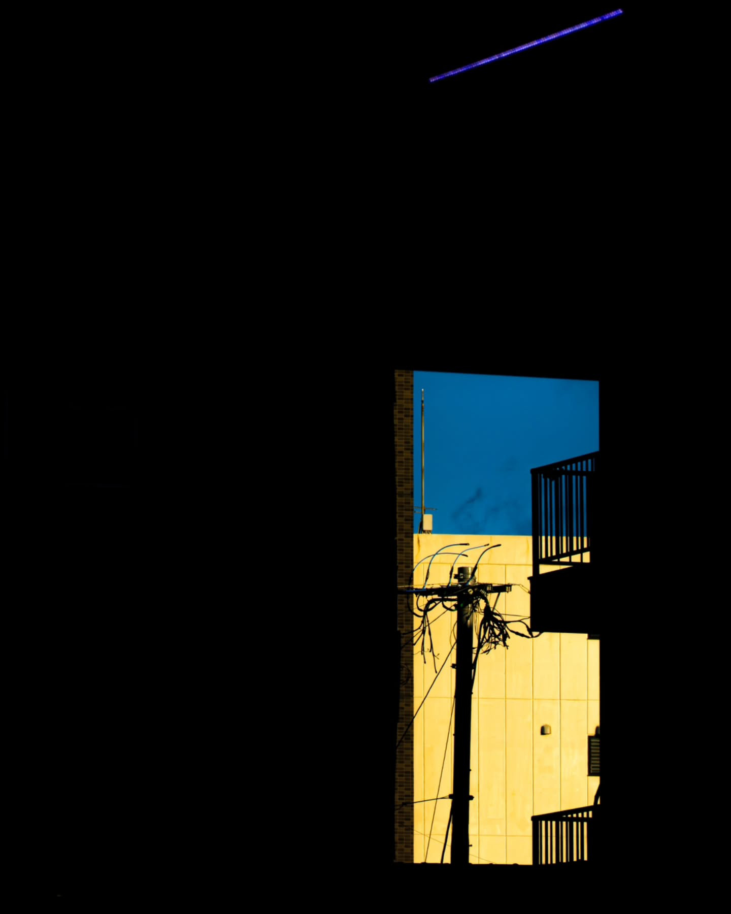 電柱の魅力を引き立てる為に作られたような間に、空と陽の当たる建物の色合いも絶妙です。