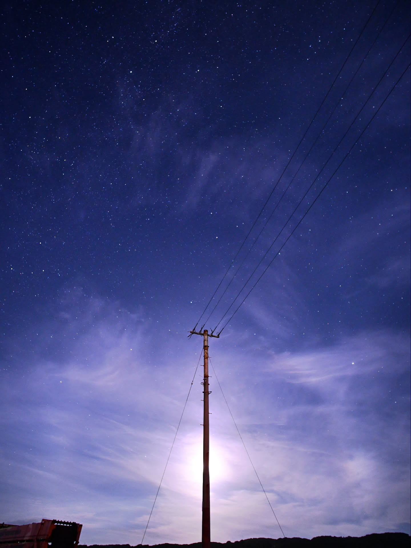 種子島の写真とのことです。夜空が綺麗ですね~!夜の写真、色合いは寒色、通常は寂しさを思う色だけれど、この写真には温かさを感じます。雲と光の加減でまるでオーロラのようにも見えます。水平に張った電線と、電柱を支える支線のピンとした張り。電線の終着だからこそ、物語性があって、見事な1枚だと思います。