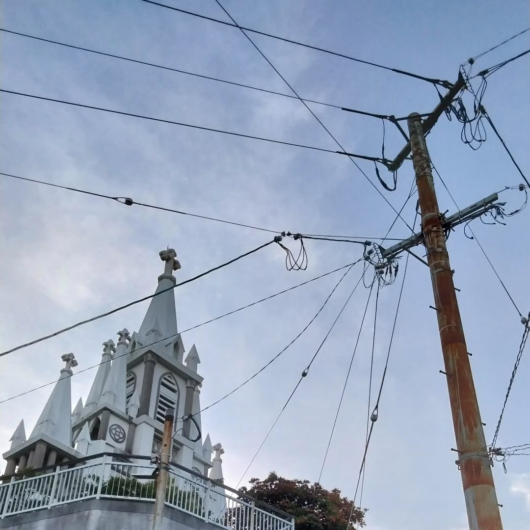 色んな人の大事な思いや祈りも電気を通じて支えている、という1枚かもしれません。電気がなかった時代は、ロウソクだったのでしょうかね。複雑な地形に合わせるように独特の配線が多い長崎の電柱ですが、教会に静かに線をつないでします。電柱自体にも歴史を感じて、静かに見てしまう1枚でした。