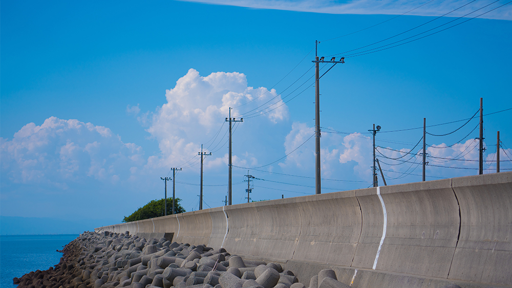 夏の雲を背景に、海に向かって立つ電柱たちが