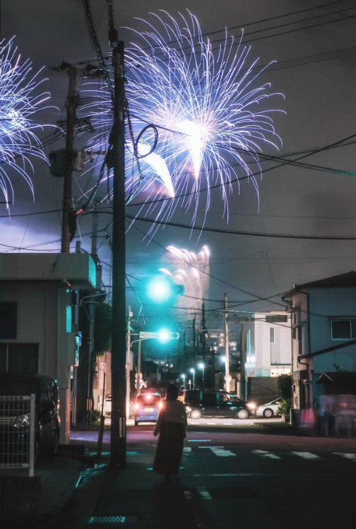 路上から遠くに見える花火 ひとりぽつんと立つ人