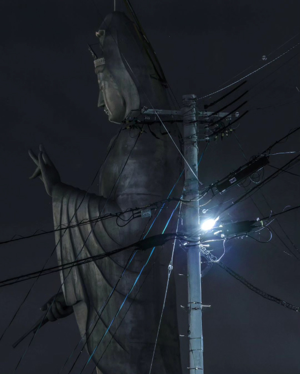大仏が動き出しそうでもあり、大仏が肩に電柱を装備しているようでもあり