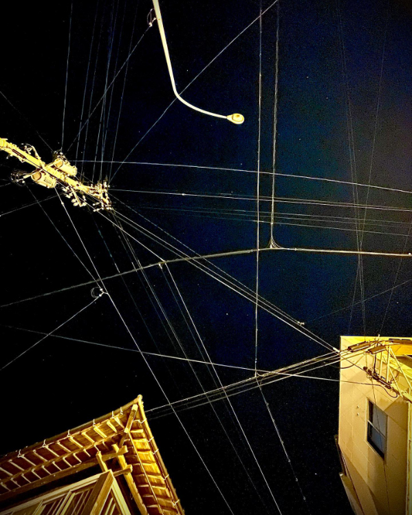 夜空を背景に、明かりに照らされた電線がハッキリ見える