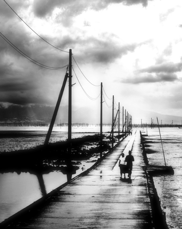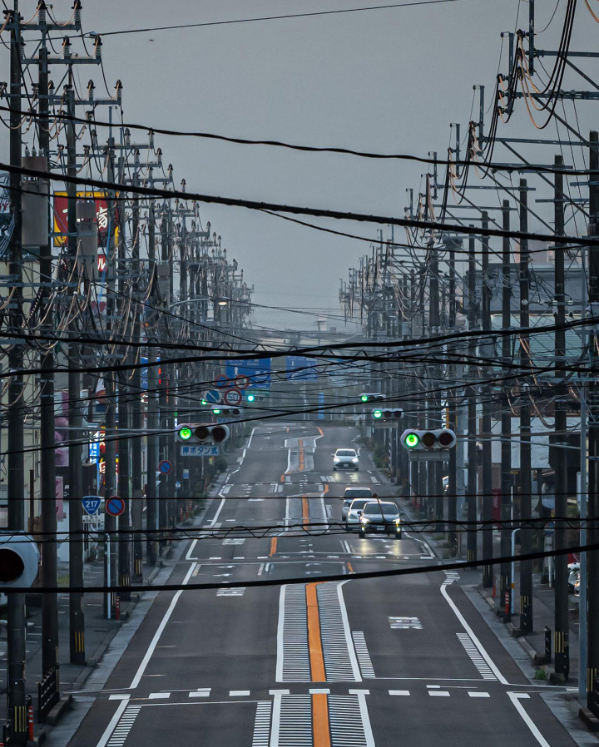 シンメトリーでとても密集感のある電柱群ですね。中央に走る橙と飲食店の看板と青信号がモノトーンな画面に色を差していて効果的だと思いました。 (講評 田中)