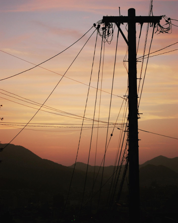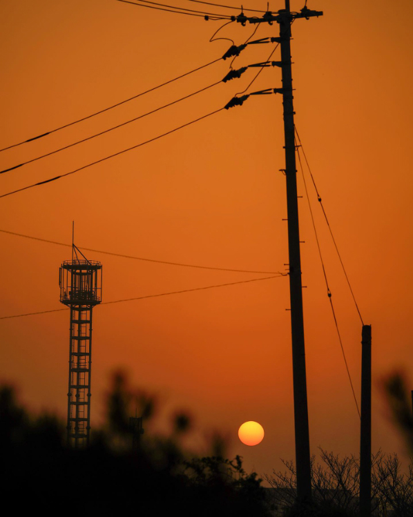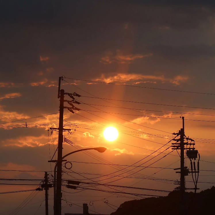 電柱の下の方へと夕陽が沈んでいく雰囲気が良いですね。地形を活かした素敵な一枚です。