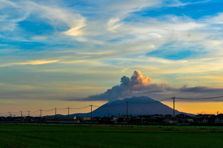 桜島上空の噴煙(雲?)が夕陽に照らされているのも良いアクセントになっていますね。