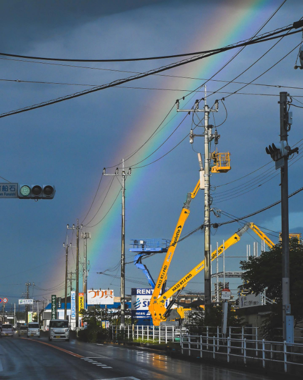 電線のラインと虹のラインが揃っていて、電柱と電線が綺麗にデコレーションされたみたいで美しいです。 (講評 栗山)