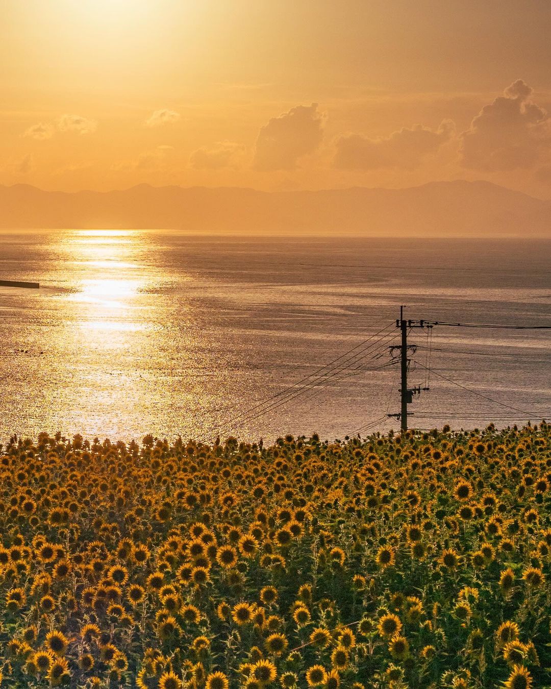 一面に広がるひまわりの中にポツンと電柱を配置した構図の良さが素敵です。