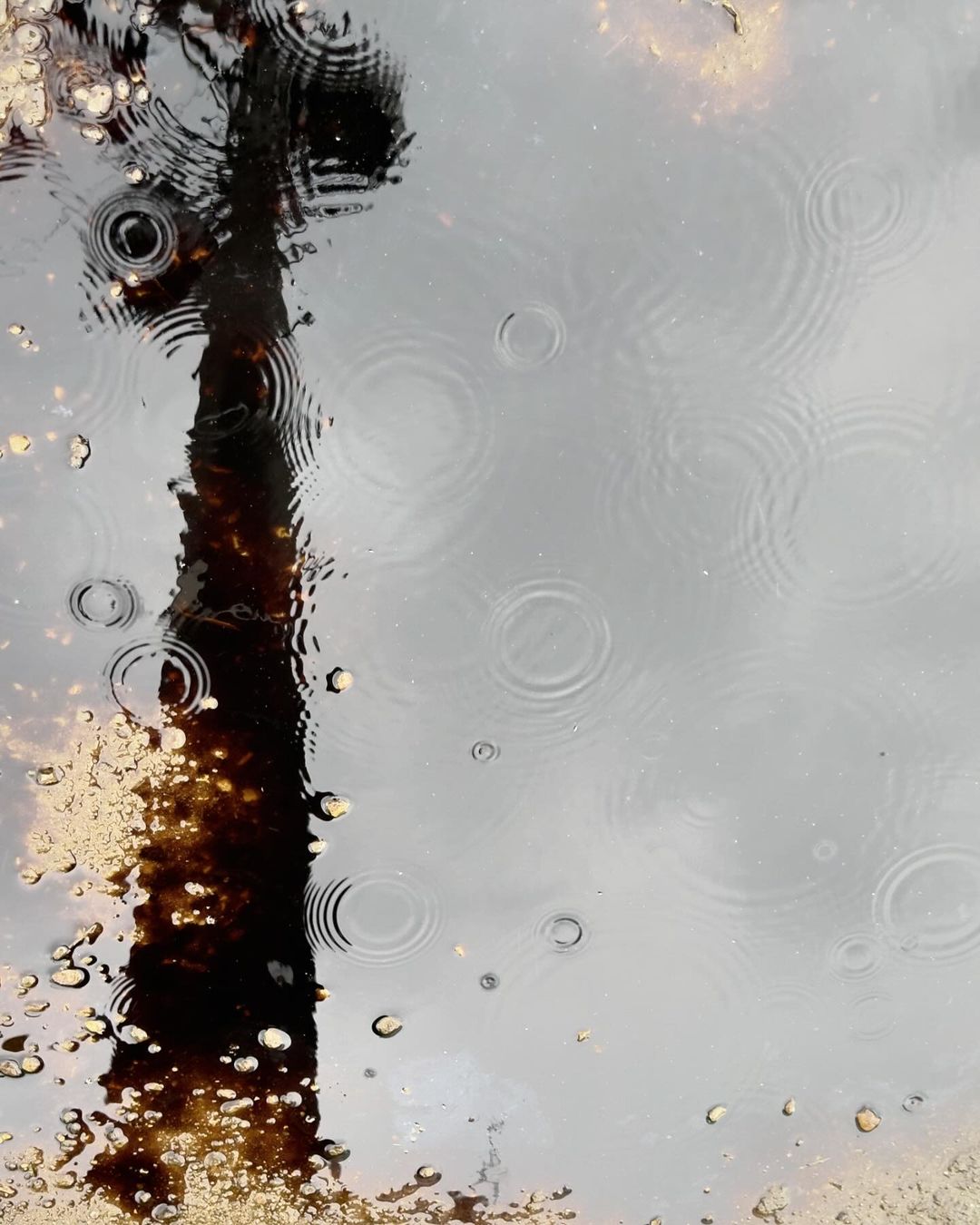 私には、撮影技術は全くわからないのですが、素晴らしいと思った一枚。雨粒がドット模様になって、それがくっきりと水溜まりに落ちていて。