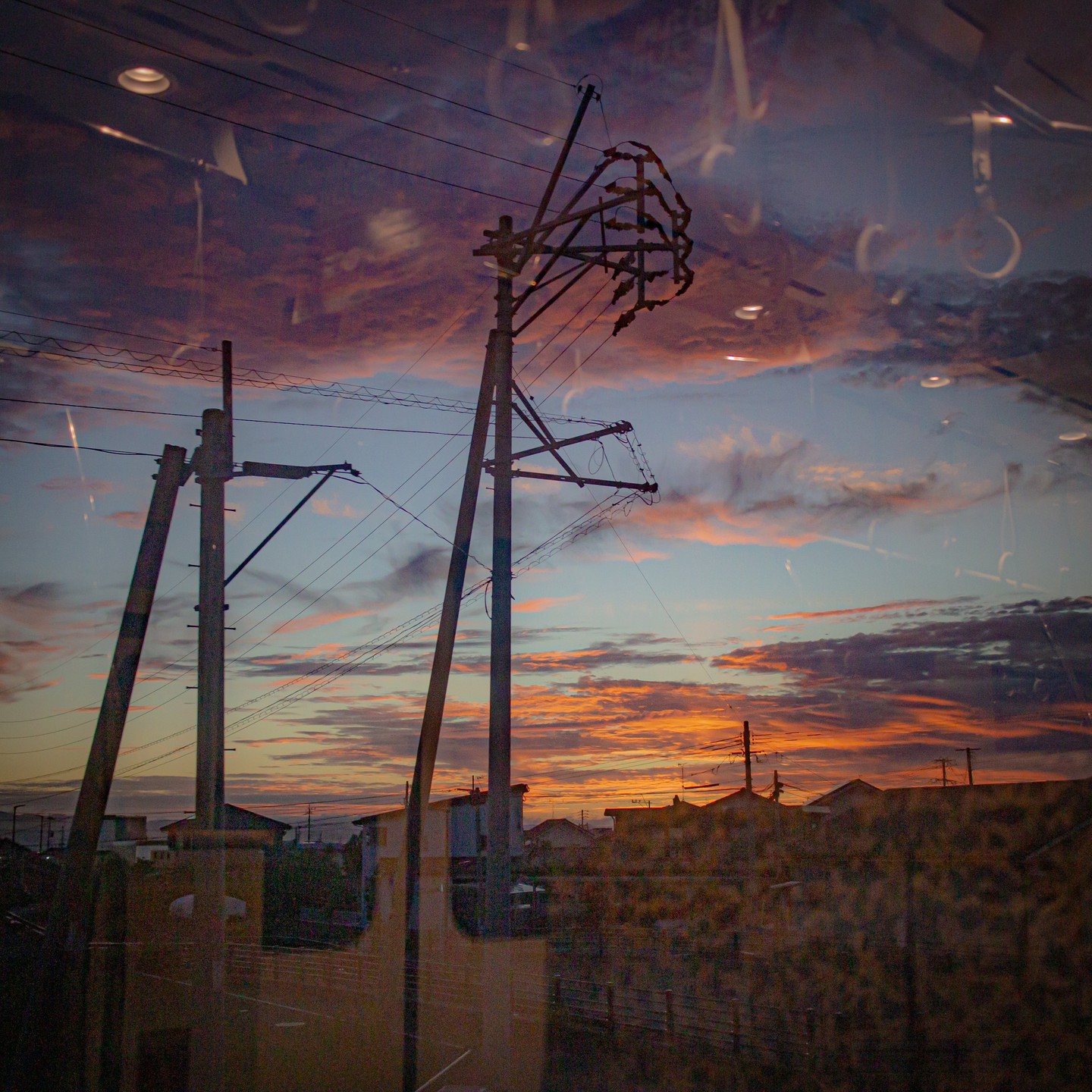電車の車窓から見えた電柱と夕日雲にノスタルジーなエモさを感じる素敵なお写真だなと思いました。日常に寄り添っている電柱がこの一枚に表現されているなと感じました。