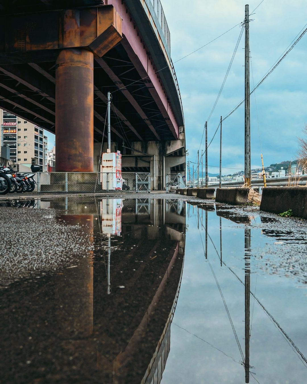 水溜まりに映る景色が本当にくっきりとしていて並んだ電柱も美しくて。